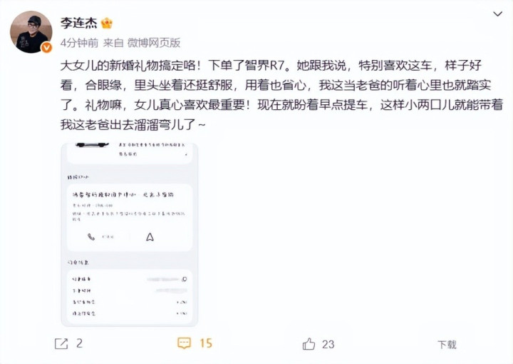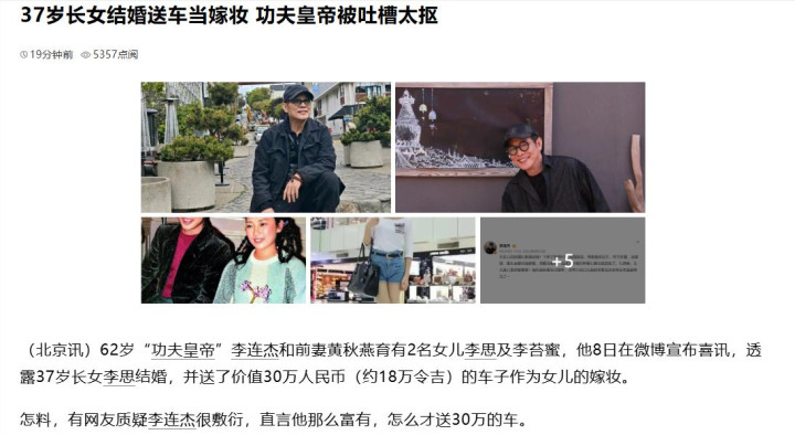 由此可以看出,30万的陪嫁车不一定就是因为李连杰抠门,也许是因为这真的是女儿想要的。